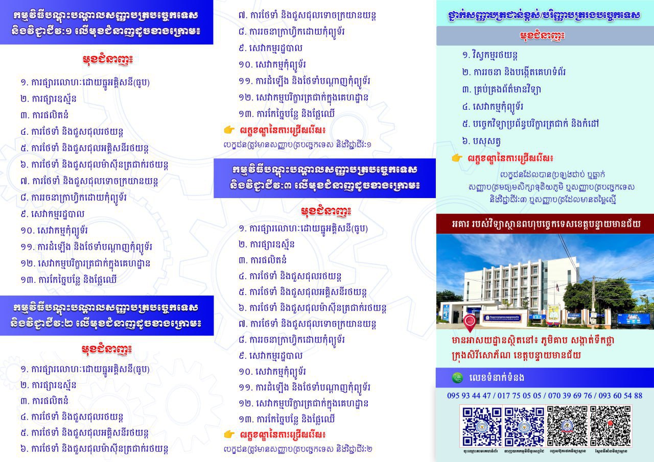 រាជធានីភ្នំពេញ ៖ វិទ្យាស្ថានពហុបច្ចេកទេសខេត្តបន្ទាយមានជ័យ នៃក្រសួងការងារ និងបណ្តុះបណ្តាលវិជ្ជាជីវៈ ផ្តល់អាហារូបករណ៍ចំនួន ២ ៣០០កន្លែង លើ ១៣មុខជំនាញ ដល់យុវជនមកពីគ្រួសារក្រីក្រ និងគ្រួសារងាយរងហានិភ័យ ព្រមទាំងផ្ដល់ប្រាក់ឧបត្ថម្ភប្រចាំខែ ក្រោមកម្មវិធីបណ្តុះបណ្តាលជំនាញវិជ្ជាជីវៈ និងបច្ចេកទេសដល់យុវជន មកពីគ្រួសារក្រីក្រ និងគ្រួសារងាយរងហានិភ័យ (TVET 1.5M)។ សម្រាប់ប្រជាពលរដ្ឋ និងយុវជន ដែលមិនមែនជាក្រុមគោលដៅ ក៏អាចស្នើចុះឈ្មោះចូលសិក្សា បានដោយឥតគិតថ្លៃផងដែរ ប៉ុន្តែមិនទទួលបានប្រាក់ឧបត្ថម្ភនោះឡើយ ។