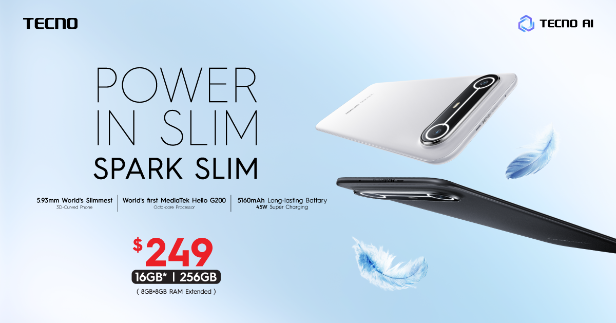 រាជធានីភ្នំពេញ ៖ ថ្មីៗនេះក្រុមហ៊ុនស្មាតហ្វូន TECNO បានប្រកាសជាផ្លូវការនូវការនូវស្មាតហ្វូនថ្មីរបស់ខ្លួន គឺ TECNO SPARK Slim ដែលជាស្មាតហ្វូនអេក្រង់កោងស្តើងបំផុតលើពិភពលោក ដោយវាមានកម្រាស់ត្រឹមតែ 5.93mm ប៉ុណ្ណោះ ។ ទោះជាកម្រាស់ 5.93mm តែ SPARK Slim នូវរក្សាទំហំថាមពលថ្មដ៏ធំ 5160mAh ជាមួយនឹងរូបរាងរឹងមាំបំផុតដែលបានឆ្លងកាត់ការបញ្ជាក់វិញ្ញាបនប័ត្រ ការពារធ្លាក់ និងធន់កម្រិតយោធាដើម្បីធានានូវភាពធន់ ។
