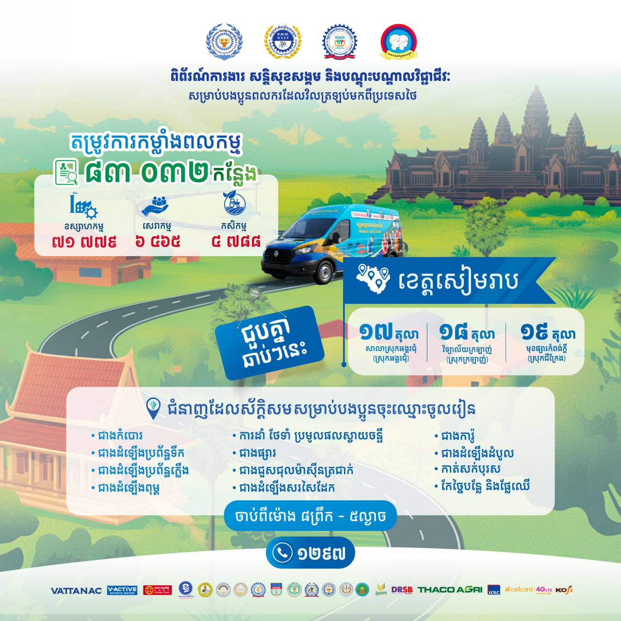 រាជធានីភ្នំពេញ ៖ ទីភ្នាក់ងារជាតិមុខរបរ និងការងារ (NEA) នៃក្រសួងការងារ និងបណ្តុះបណ្តាលវិជ្ជាជីវៈ នឹងបន្តរៀបចំពិព័រណ៍ការងារ សន្តិសុខសង្គម និងបណ្តុះបណ្តាលវិជ្ជាជីវៈ នៅខេត្តសៀមរាប នាចុងសប្ដាហ៍នេះ ដោយនាំយកឱកាសការងាររាប់ម៉ឺនកន្លែង ជូនបងប្អូនពលករត្រឡប់មកពីថៃ និងយុវជនដែលកំពុងស្វែងរកការងារធ្វើ។ នេះបើតាមការឱ្យដឹងពីលោក ស៊ុន មេសា អ្នកនាំពាក្យក្រសួងការងារ និងបណ្តុះបណ្តាលវិជ្ជាជីវៈ ។