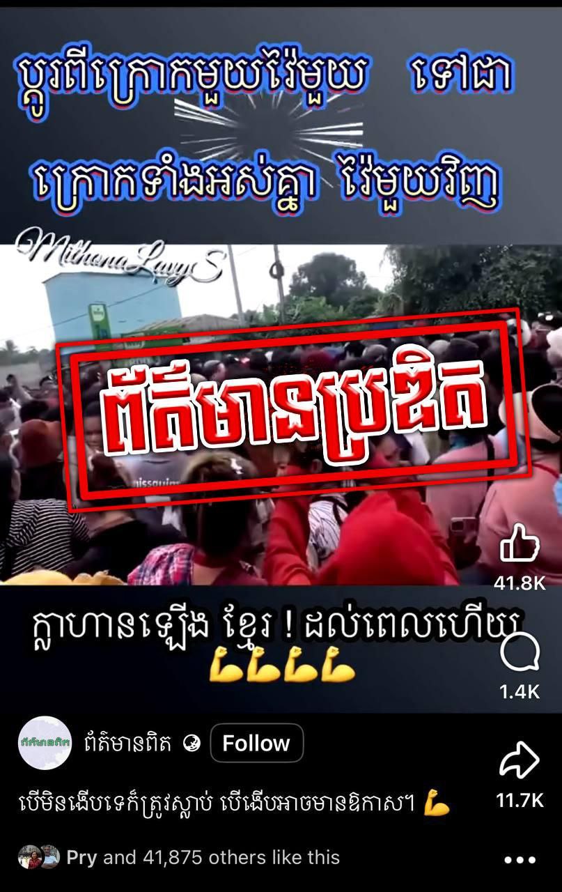បើតាមលោក ស៊ុន មេសា ម្ចាស់ហ្វេសប៊ុកផេក ព័ត៌មានពិត កំពុងយករូបភាពសកម្មភាពកម្មករទៅកាត់តច្នៃប្រឌិត ក្នុងចេតនាញុះញង់ ប្រជាពលរដ្ឋតាមរយៈបណ្តាញសង្គម ឱ្យងើបឡើងបះបោរ ផ្តួលរំលំ រាជរដ្ឋាភិបាលស្របច្បាប់ និងកៀរគរប្រជាពលរដ្ឋឱ្យធ្វើសកម្មភាពផ្សេងៗ ផ្ទុយនឹងច្បាប់ ។ លោកបន្តថា នេះជារឿងអគុណធម៌បំផុត ដែលម្ចាស់ហ្វេសប៊ុកផេកមួយនេះ ខំប្រឹងមួលបង្កាច់ លាបពណ៌ ទម្លាក់កំហុសគ្រប់បែបយ៉ាងមកលើរាជរដ្ឋាភិបាល ៕ អត្ថបទសហការ