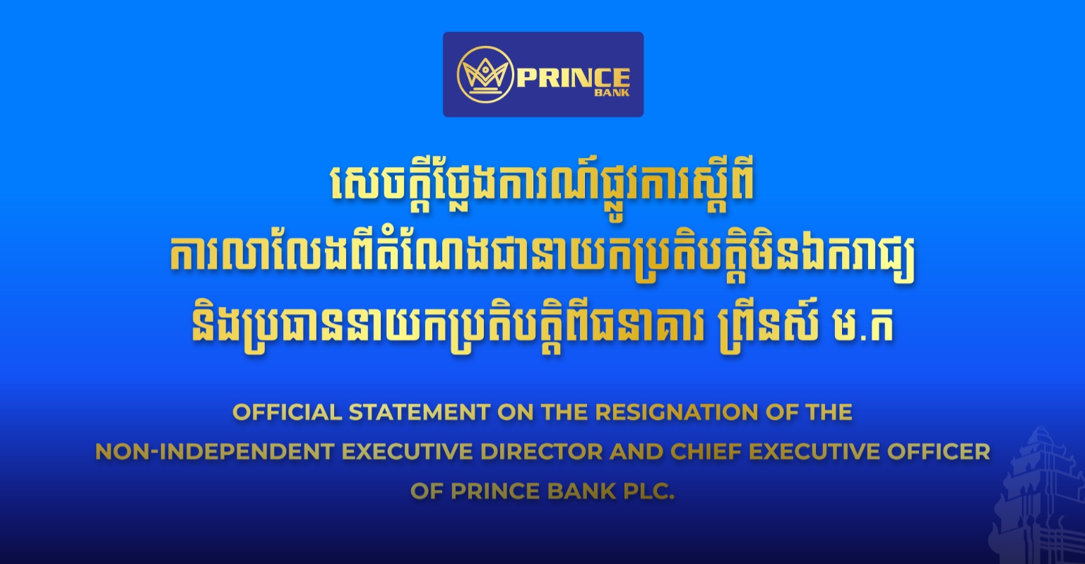 រាជធានីភ្នំពេញ, ថ្ងៃទី២២ ខែតុលា ឆ្នាំ២០២៥៖ ខ្ញុំសូមប្រកាសអំពីការសម្រេចចិត្តរបស់ខ្ញុំ ក្នុងការលាលែងពីតំណែងនាយកប្រតិបត្តិមិនឯករាជ្យ និងប្រធាននាយកប្រតិបត្តិ នៃធនាគារ ព្រីនស៍ ម.ក ដែលមានប្រសិទ្ធភាពភ្លាមៗ ចាប់ពីថ្ងៃទី ២២ ខែតុលា ឆ្នាំ២០២៥ ដើម្បីបន្តការងារផ្ទាល់ខ្លួនរបស់ខ្ញុំ ។
