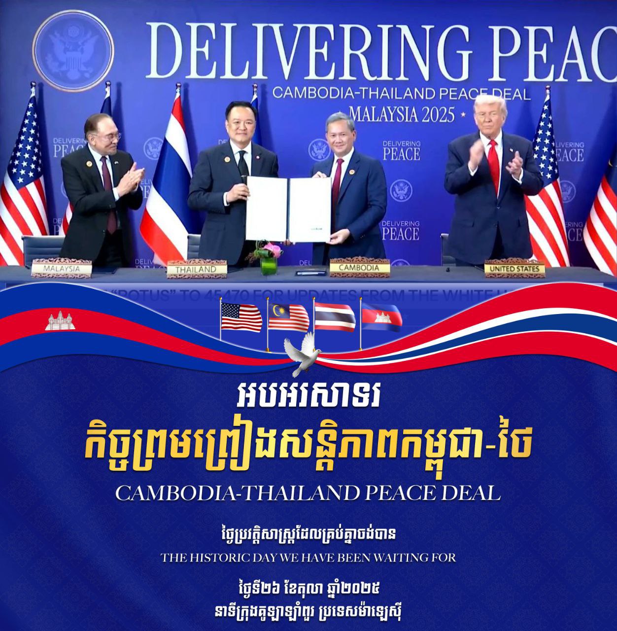 រាជធានីភ្នំពេញ ៖ ភ្លាមៗក្រោយការចុះកិច្ចព្រមព្រៀងសន្តិភាពរវាង កម្ពុជា-ថៃ នៅប្រទេសម៉ាឡេស៊ីក្រោមវត្តមានសាក្សីពីលោកប្រធានាធិបតីអាមេរិកឌូណាល់ត្រាំ និងនាយករដ្ឋមន្ត្រី ម៉ាឡេស៊ី លោក អានវ៉ា អ៊ីប្រាហីម ឯកឧត្តម ហេង សួរ រដ្ឋមន្ត្រីក្រសួងការងារ និងបណ្តុះបណ្តាលវិជ្ជាជីវៈ នៅថ្ងៃទី២៦ ខែតុលា ឆ្នាំ២០២៥ នេះ បានចេញសារអបអរសាទរយ៉ាងក្លៀវក្លាបំផុត ។